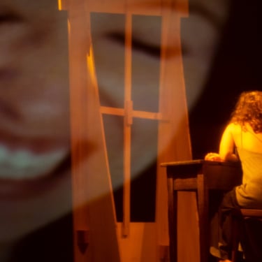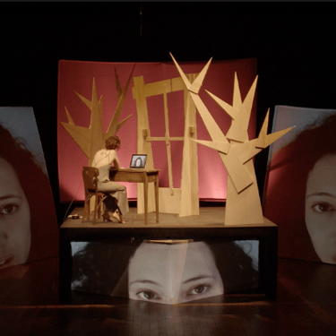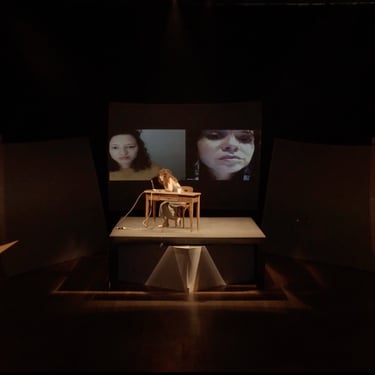A atriz que está em presença real no espaço, interpreta a personagem Verônica, se encontra encima de um suporte e dentro dele um elemento luminoso, como uma entranha, o estômago dessa casa que a engole por todas as direções, traz algumas emoções em video e em cores.