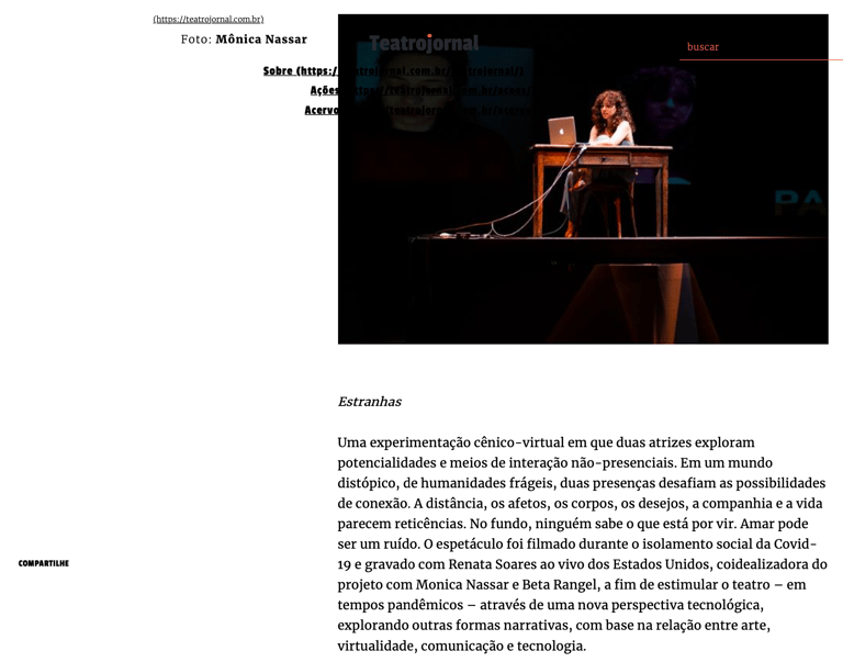 O espetáculo Estranhas vem de um estudo teatral baseado na inquietação do virtual. A peça se passa em um mundo distópico, de humanidades frágeis, onde duas presenças humanas desafiam as possibilidades de conexão. Quando não se pode sair, não se pode encontrar e muito menos tocar. A distância e o desejo são sempre os limites da realidade. A companhia e a vida parecem reticências.